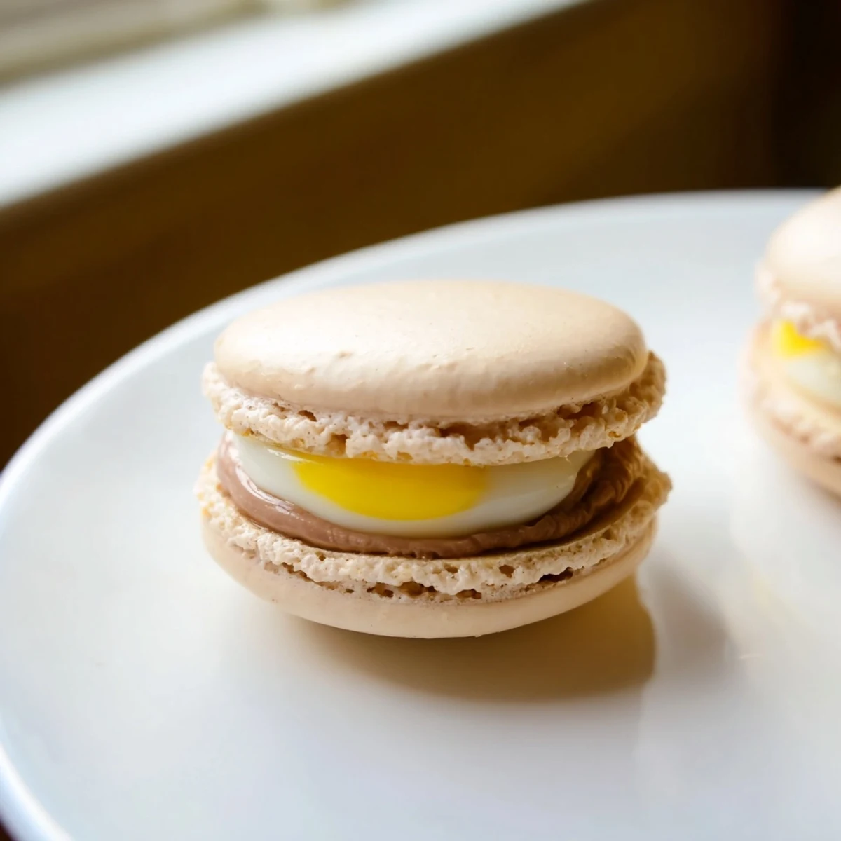 - Pipe a ring of chocolate filling onto one shell, then place a small dollop of yellow filling right in the center like a yolk. Gently press another shell on top until the filling reaches the edges, taking care not to crack the delicate shells.