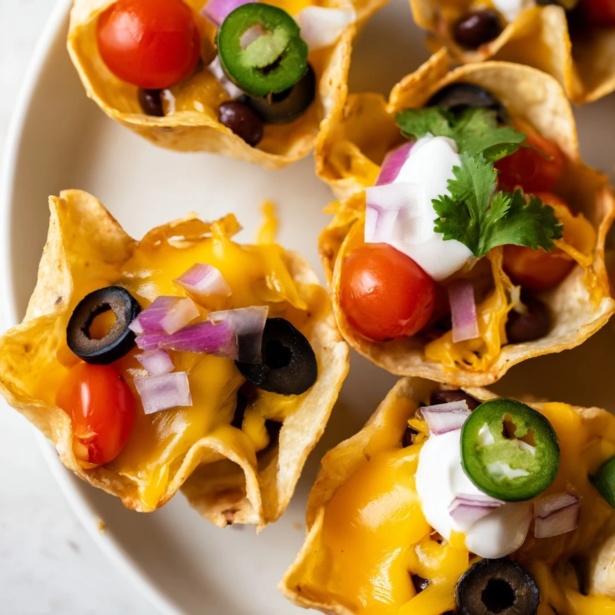 These bite-sized crispy tortilla cups transform classic nacho flavors into perfect handheld portions. Start with scoop-style chips arranged in a mini muffin tin, then load each cup with shredded cheddar and Monterey Jack cheeses. Layer on black beans, diced cherry tomatoes, sliced black olives, red onion, and optional jalapeño slices for that signature Tex-Mex kick. Bake until the cheese turns perfectly melted and bubbly, just 8-10 minutes in a 375°F oven. Finish with cool sour cream and fresh cilantro to balance the rich, savory flavors. Each cup delivers that ideal crunch-to-cheese ratio in just two bites.
