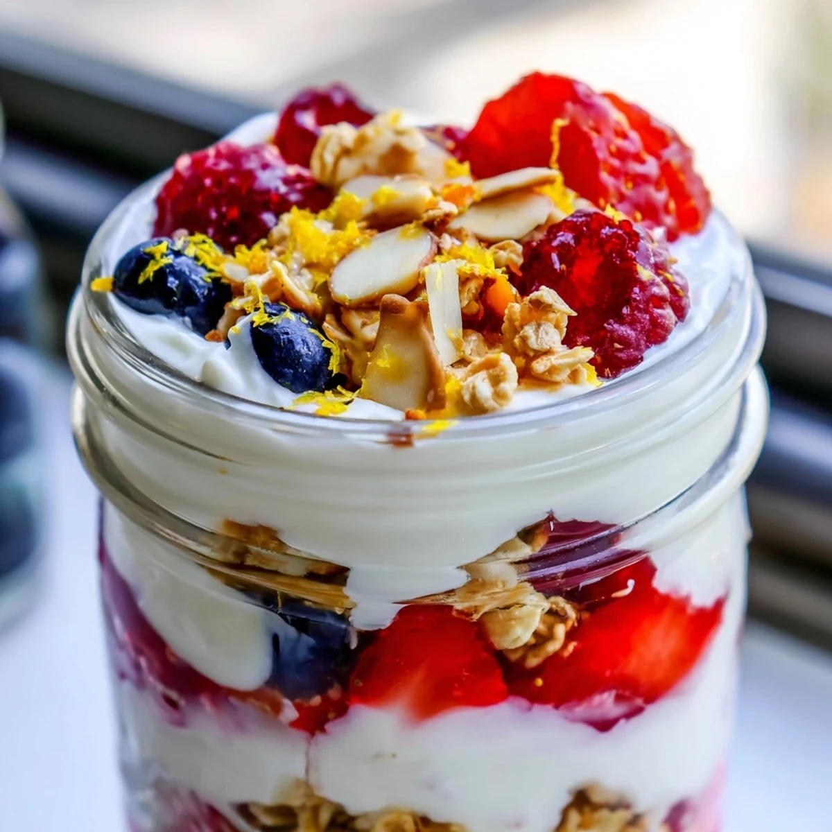 - Continue layering yogurt, honey, berries, and granola until you reach the top, ending with a final dusting of granola and any extras like nuts, chia seeds, or lemon zest.