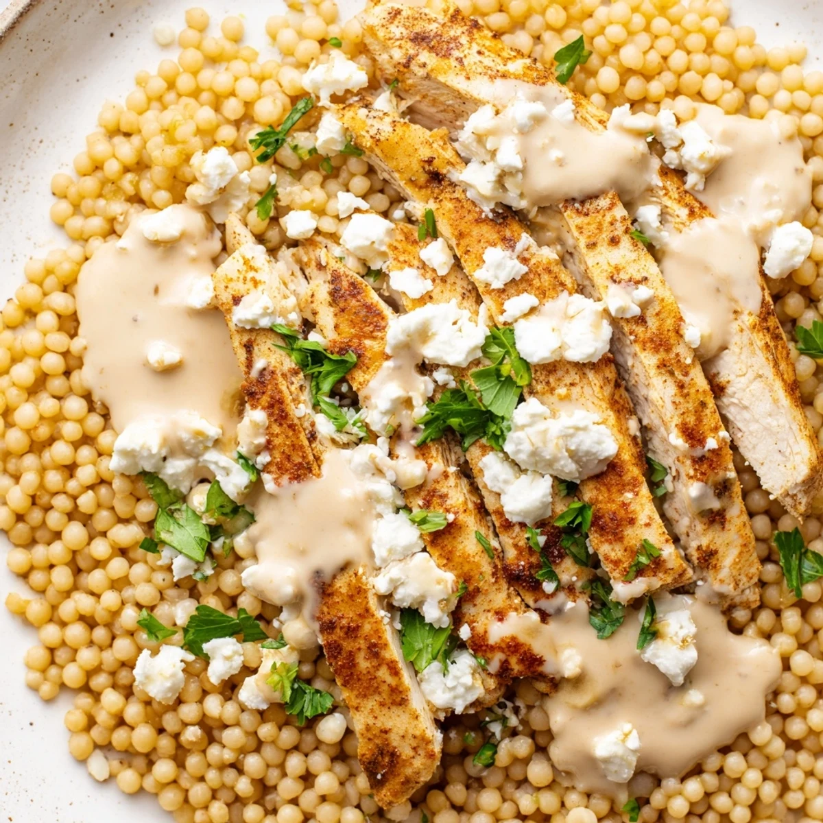 This vibrant bowl brings together tender Mediterranean-spiced chicken, fluffy couscous, and crisp vegetables for a satisfying meal. The chicken marinates in olive oil, garlic, cumin, smoked paprika, and oregano, then grills to golden perfection. Meanwhile, couscous steams to fluffy lightness. Fresh cherry tomatoes, cucumber, red onion, Kalamata olives, and baby spinach add color and crunch. A creamy lemon-tahini sauce ties everything together with its tangy, nutty finish. Ready in 45 minutes, this bowl serves four and can be easily adapted for gluten-free or dairy-free diets.