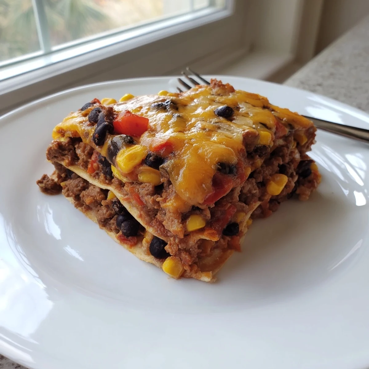 This hearty Tex-Mex inspired dish transforms classic lasagna by swapping traditional pasta for soft flour tortillas. Each layer features seasoned ground beef sautéed with onions, garlic, and bell peppers, combined with black beans, sweet corn, and diced tomatoes. The assembly alternates between tortillas, the savory meat and vegetable mixture, and generous amounts of shredded Mexican cheese blend. After baking until bubbly and golden, the result is a comforting casserole that feeds six hungry people. The dish comes together in about an hour of active preparation and cooking time, making it perfect for weeknight dinners or weekend gatherings.