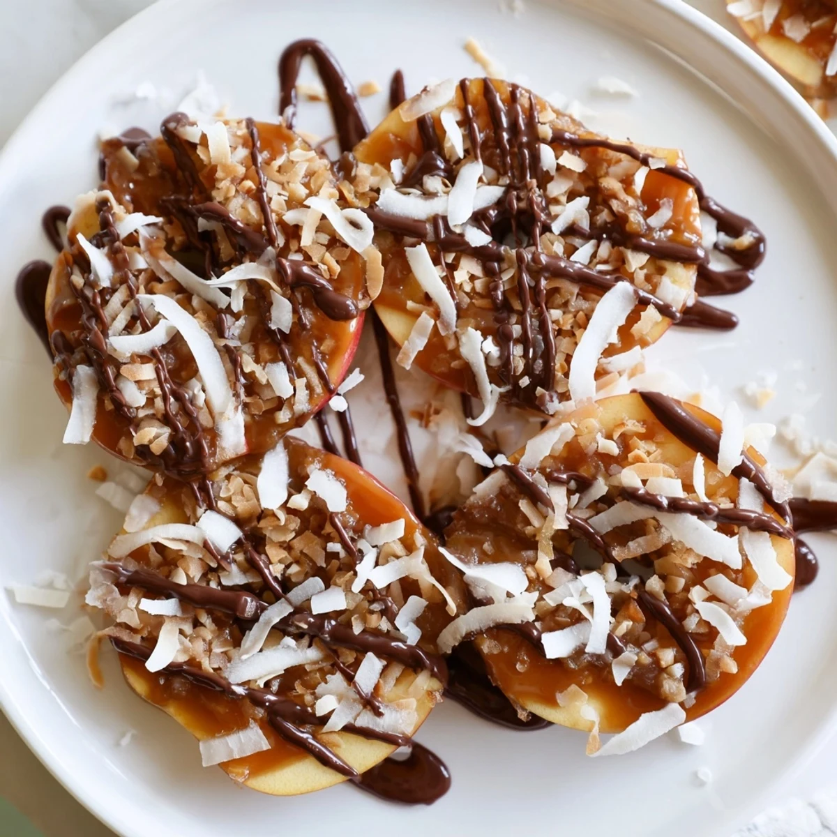 These Samoa Apple Slices turn crisp apple rounds into a caramel-and-coconut treat in about 20 minutes total. Toast the shredded coconut until lightly golden, slice apples into 1/4-inch rounds, spread warm caramel, press on the toasted coconut, and finish with a smooth melted chocolate drizzle. Let set for a few minutes and serve; serves 6 with optional toasted nuts or dairy-free swaps.
